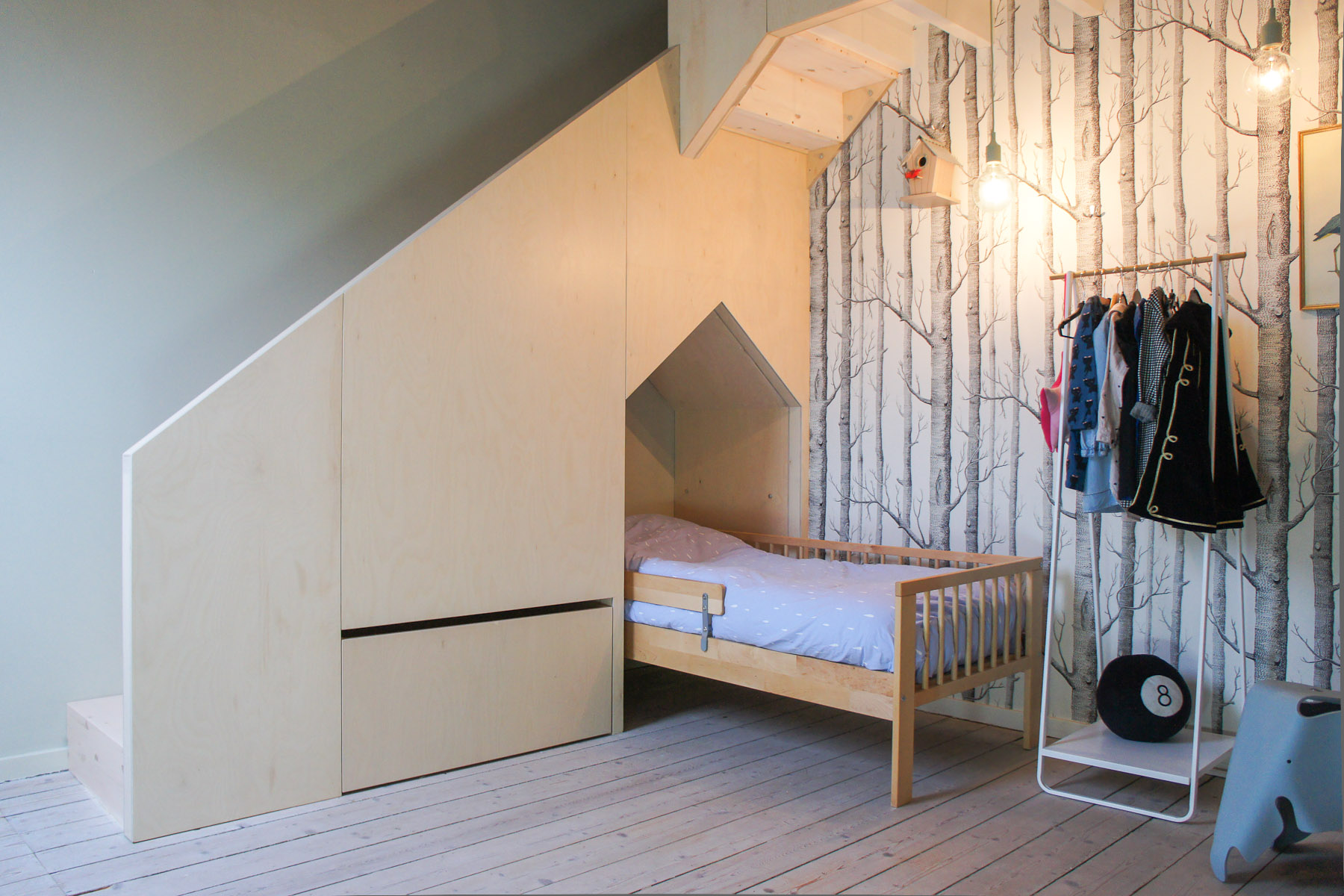 trapje in kinderkamer naar duplex, met ingewerkt huisje en bureau