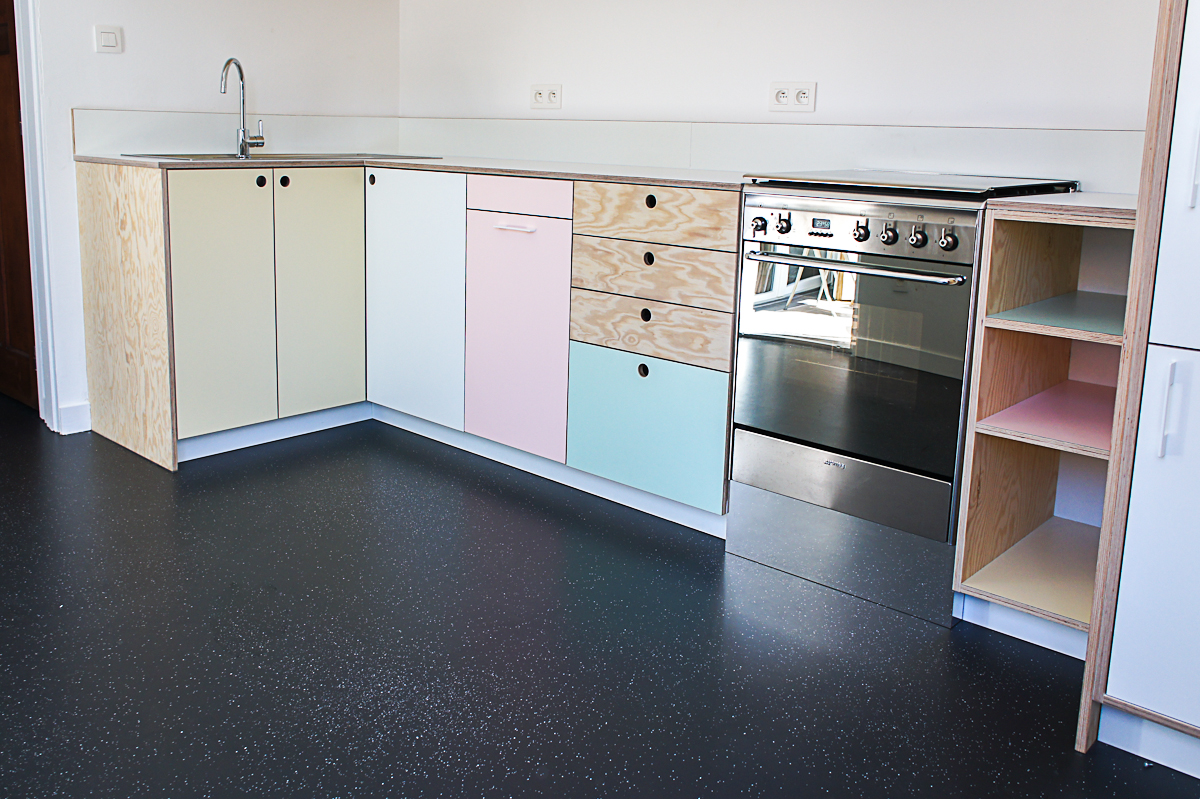 Kitchen in pine plywood with pastel colored laminate Kitchen in pine plywood with pastel colored laminate