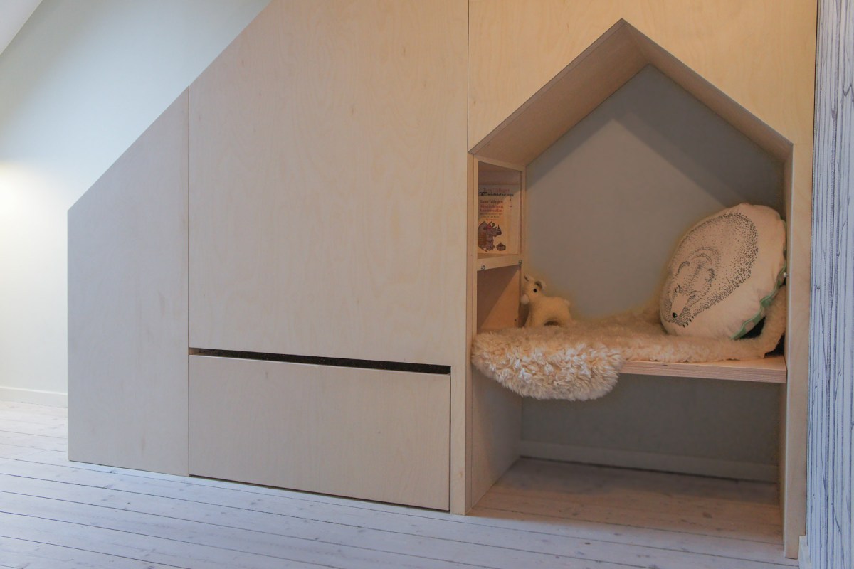 trapje in kinderkamer naar duplex, met ingewerkt huisje en bureau